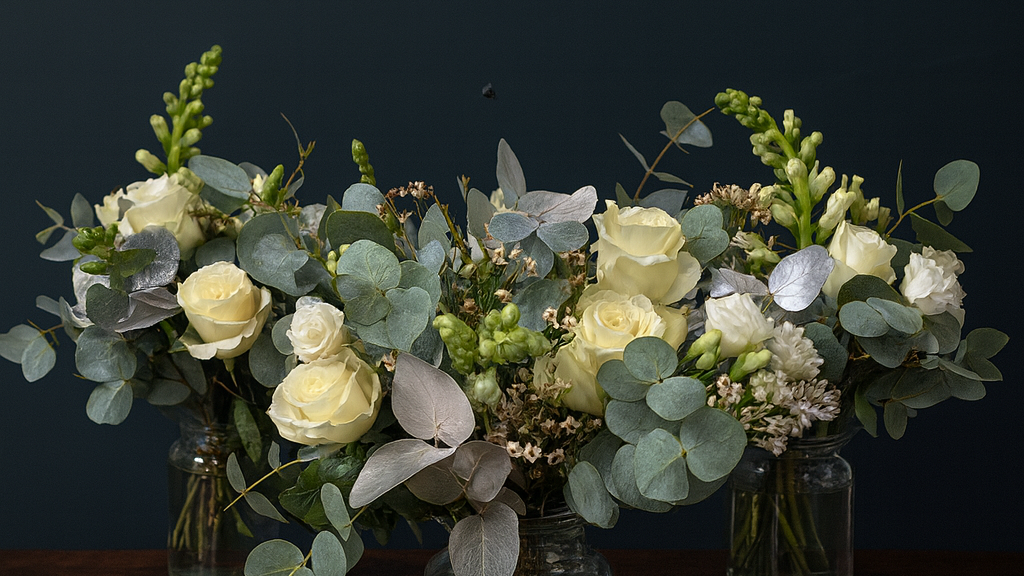 Includes: 2 x Vase arrangements and 3 x Jam jar arrangements