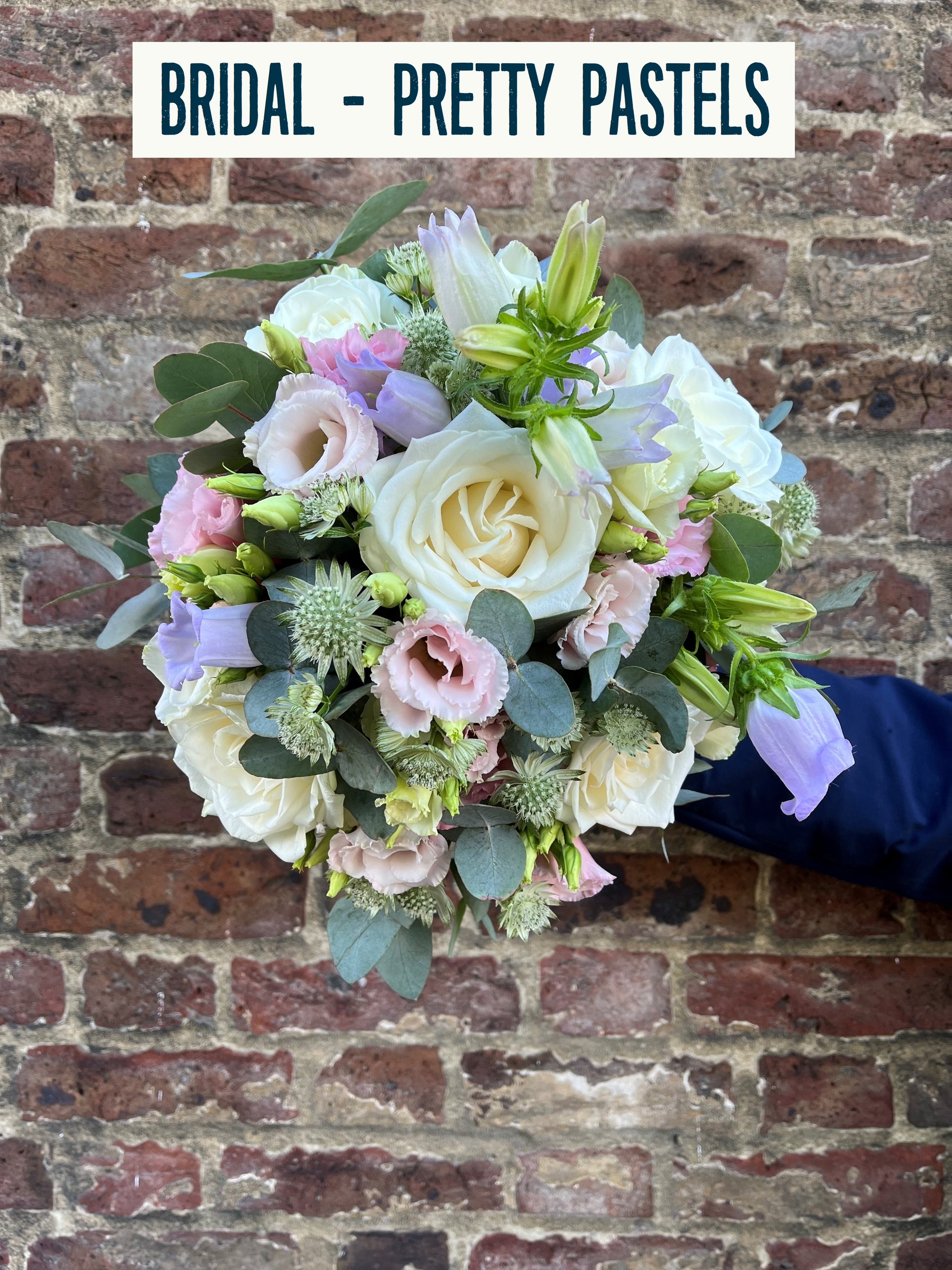Bridal Bouquet (£95): An elegant arrangement of seasonal blooms softened with greenery, tied with ivory ribbon.