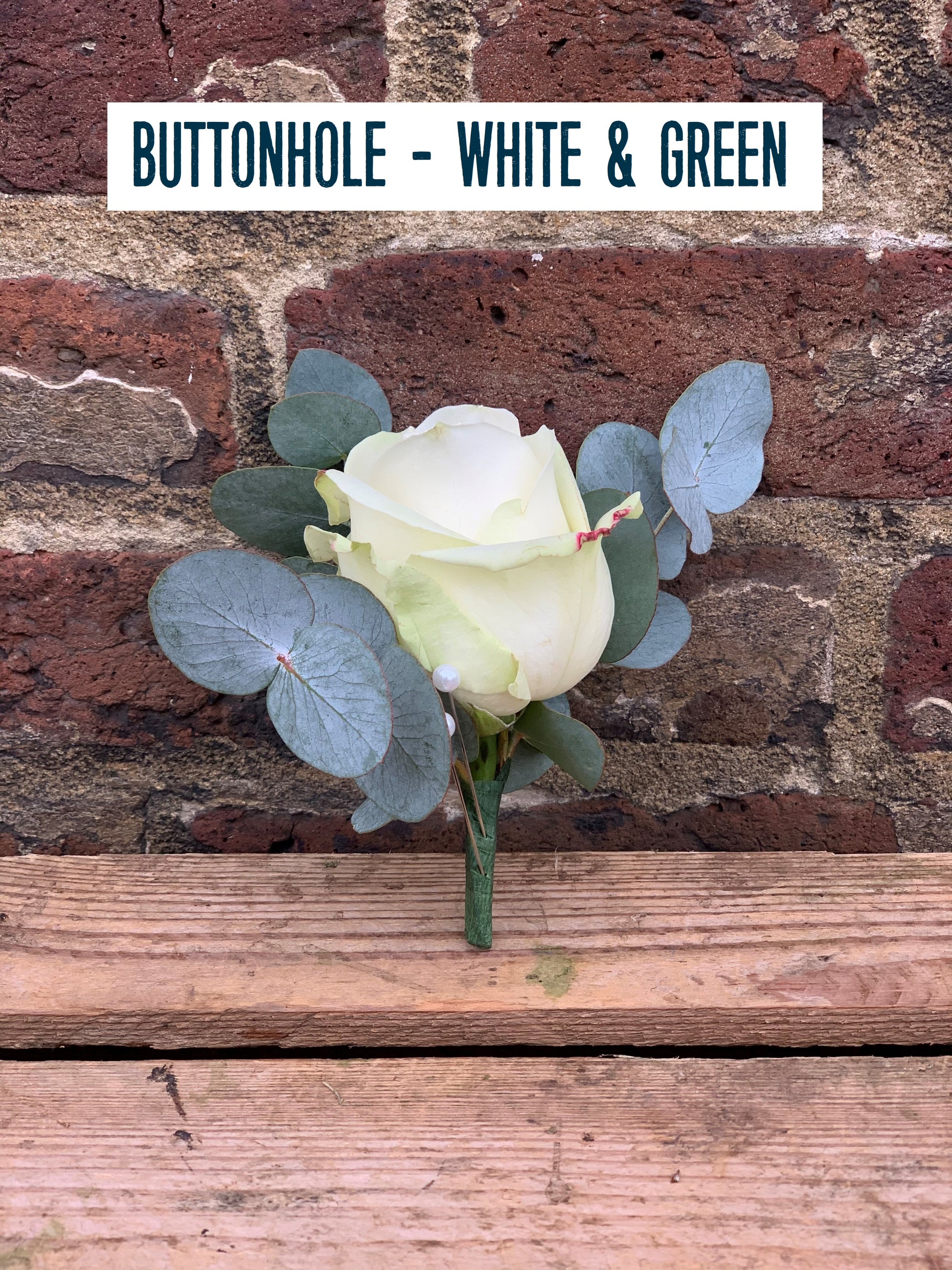 Buttonholes (£10): A rose paired with greenery and an extra flower bud for the groom, secured with a pin.
