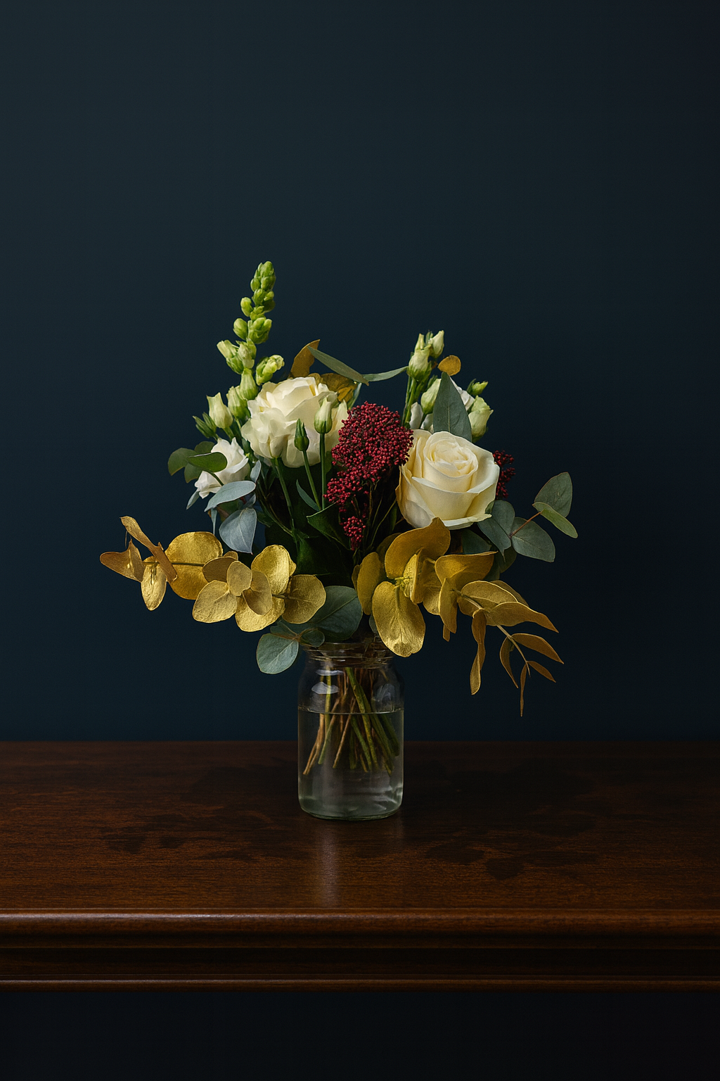 Celebrate the season in style with Step Into Christmas, a beautiful set of 2 vases and 3 jam jars filled with a luxurious mix of seasonal flowers and foliage. Rich reds, soft whites, glowing gold accents, and lush greenery come together to create a warm, joyful palette that captures the true spirit of Christmas.