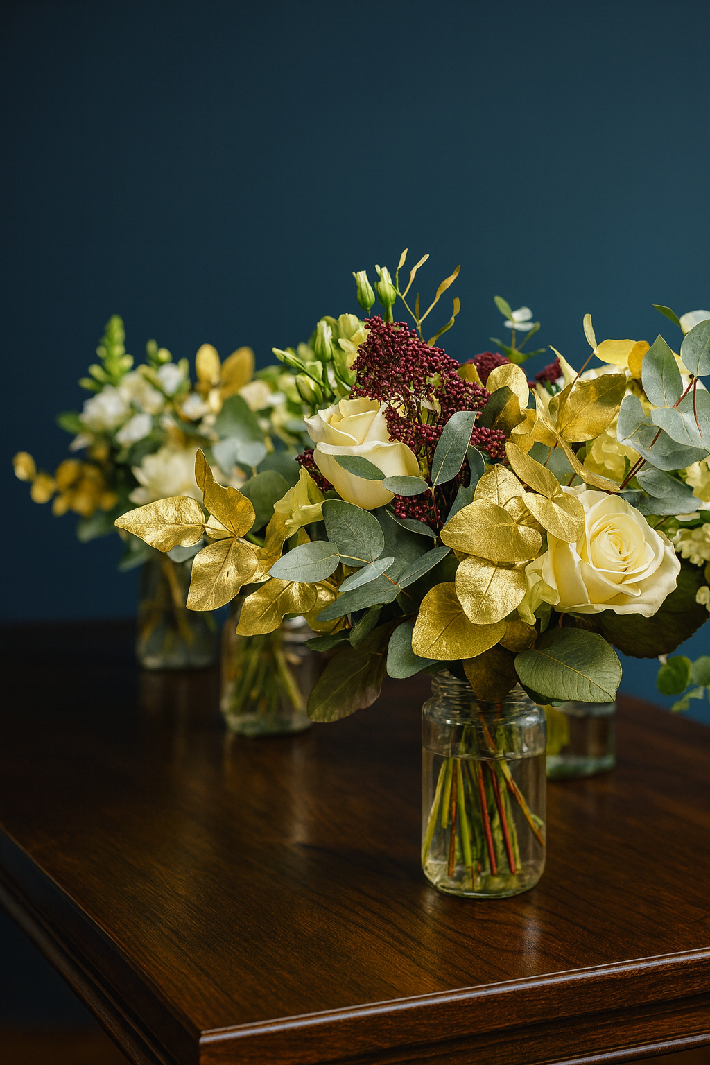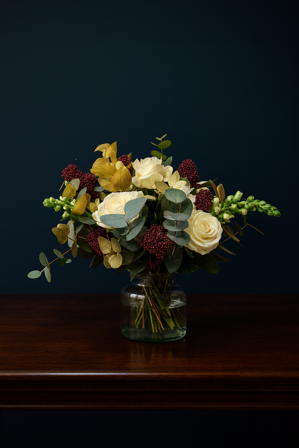 Each arrangement is thoughtfully designed to bring depth, colour, and festive elegance into your home — from the radiant gold highlights to the rich, velvety tones of classic seasonal blooms.